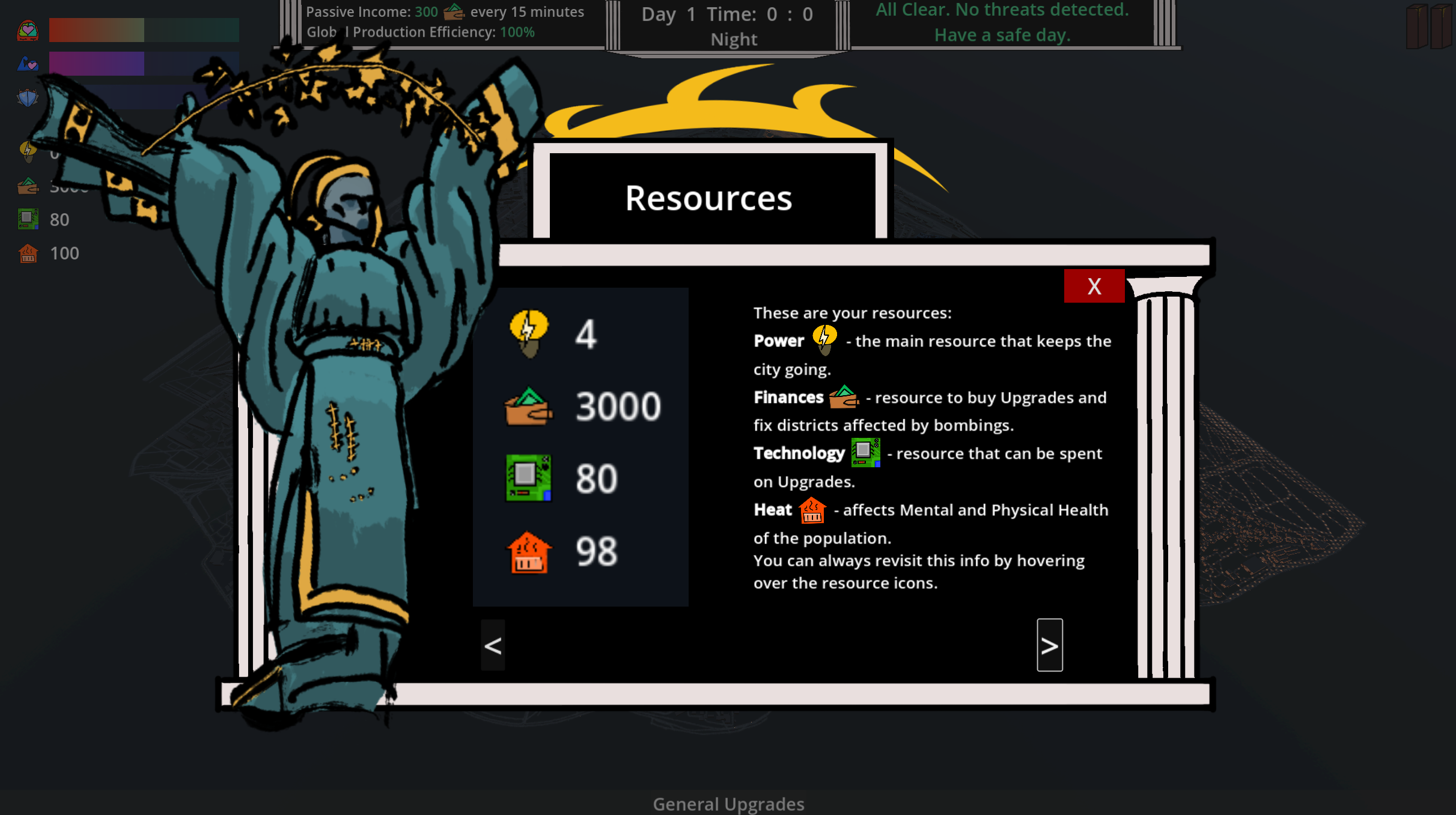 Try to keep your city alive by managing resources and distributing the limited Power across various districts. You will face regular rocket attacks, receive donations and experience unpredictable events: some are funny, some are helpful, and some are rather hard to handle. Buy upgrades and strive to fill your Protection indicator - only by achieving 100% protection of your city you will win (hint: some Protection could be received only by donations from partners, so don't forget about your diplomacy).